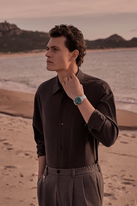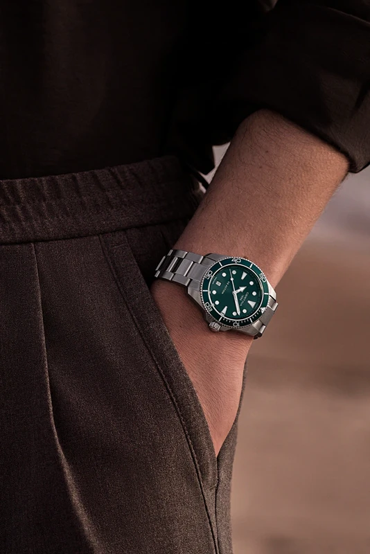 Den gröna urtavlan och matchande tavelringen ger klockan ett levande och fräscht uttryck med tydlig koppling till havets djup. De applicerade punktindexen och kraftiga visarna skapar utmärkt läsbarhet, medan boett och armband i rostfritt stål ger en tidlös robusthet. Med sina 40 mm erbjuder modellen en klassisk sportig proportion som sitter stadigt och bekvämt på handleden perfekt både till vardags och vid aktivitet.